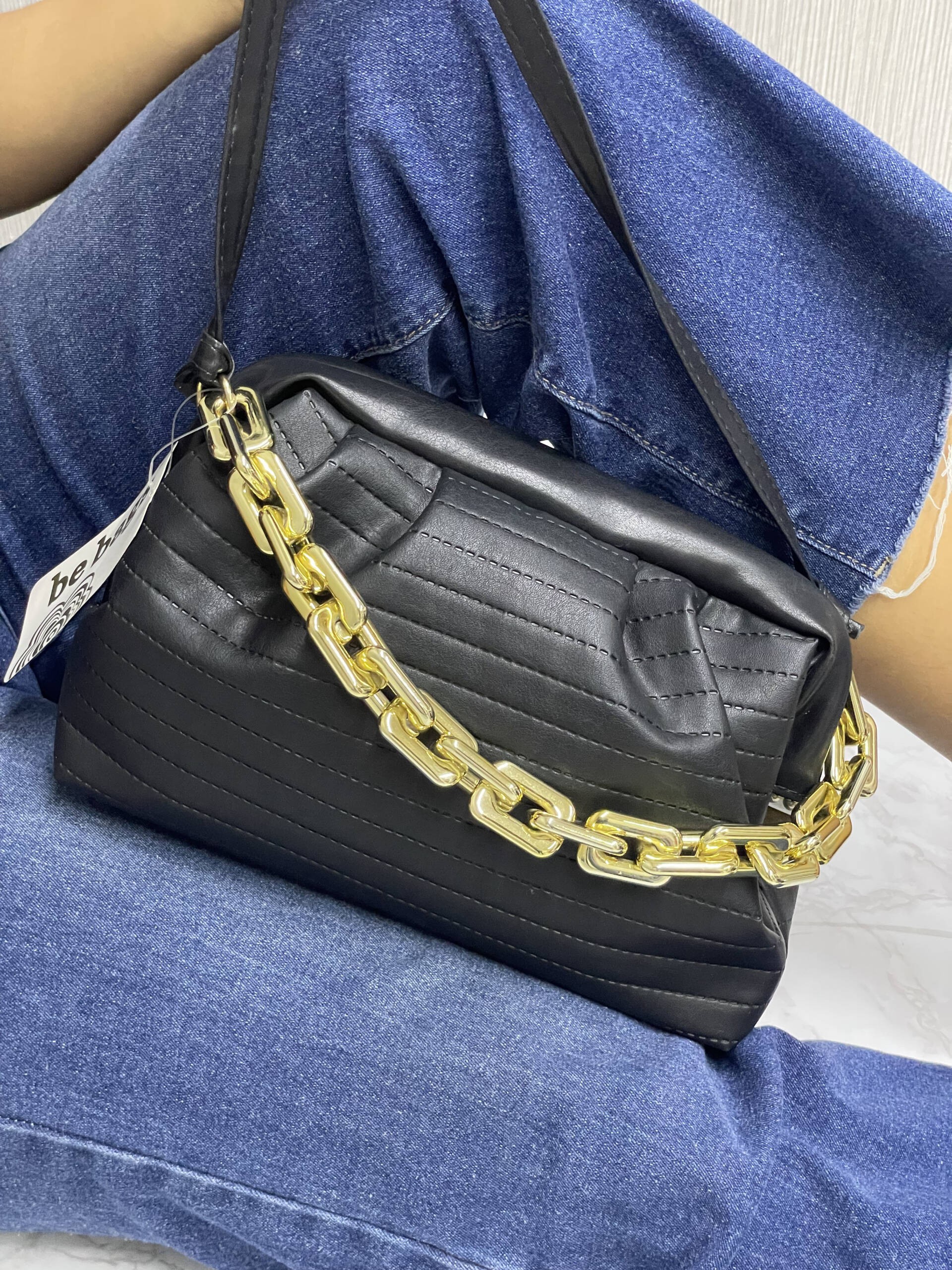 Descripción: Bolsa mediana, fabricada con material sintético, detalles y herrajes color oro; cuenta con dos asas una que es ajustable al hombro y la otra no es ajustable, de adorno en la parte de enfrente cuenta con una cadena.