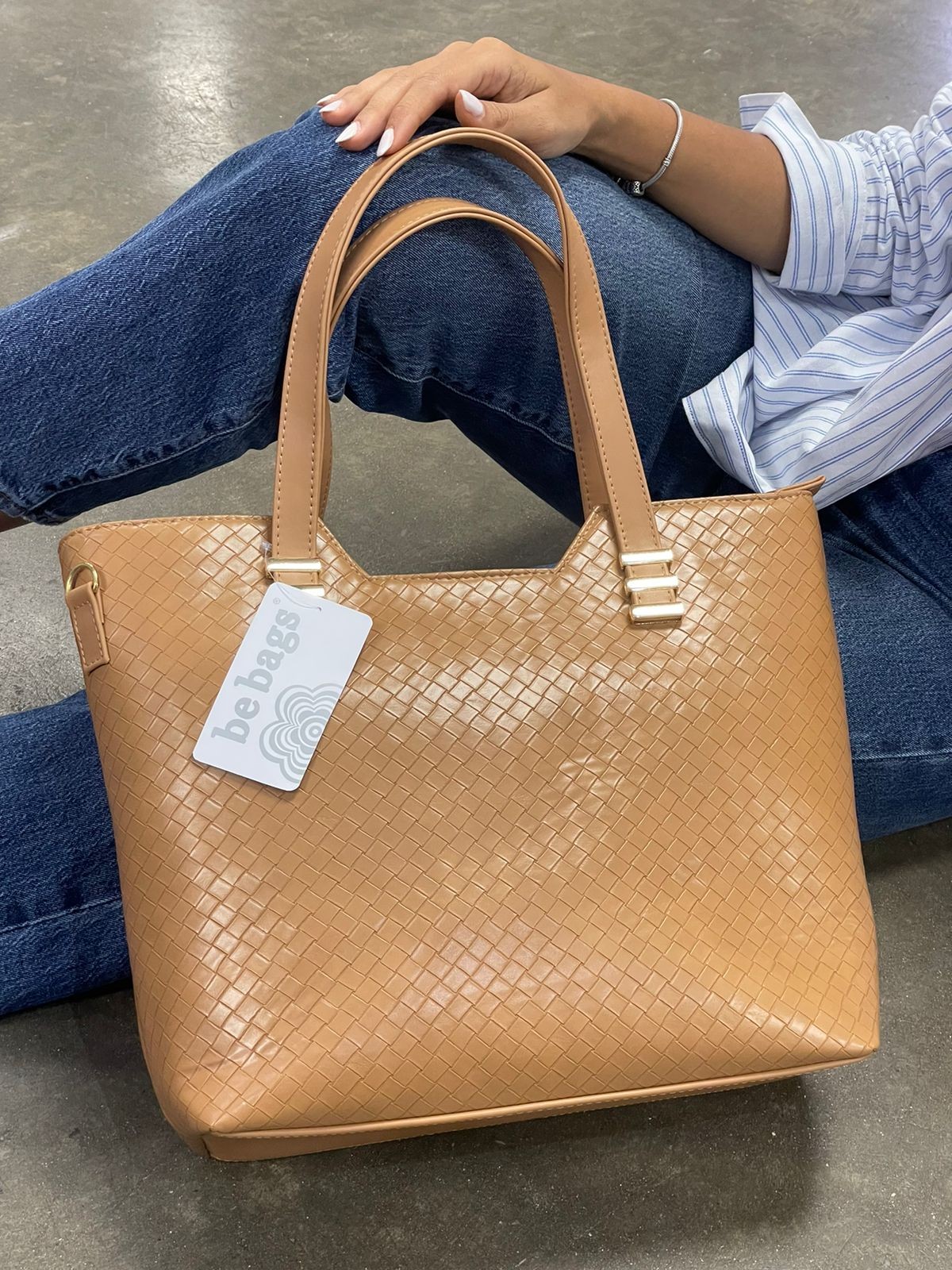 Descripción: Bolsa fabricada con material sintético y textil, con herrajes color oro; cuenta con bolsa interna con cierre.