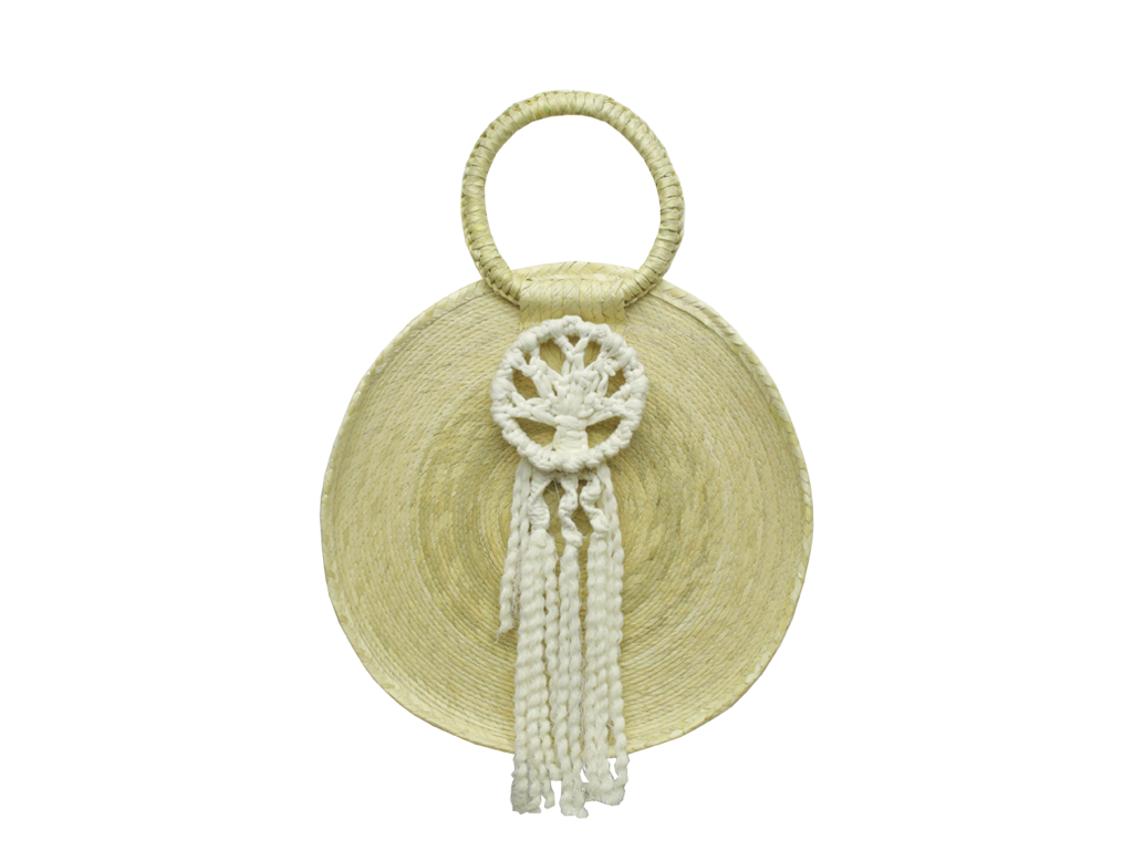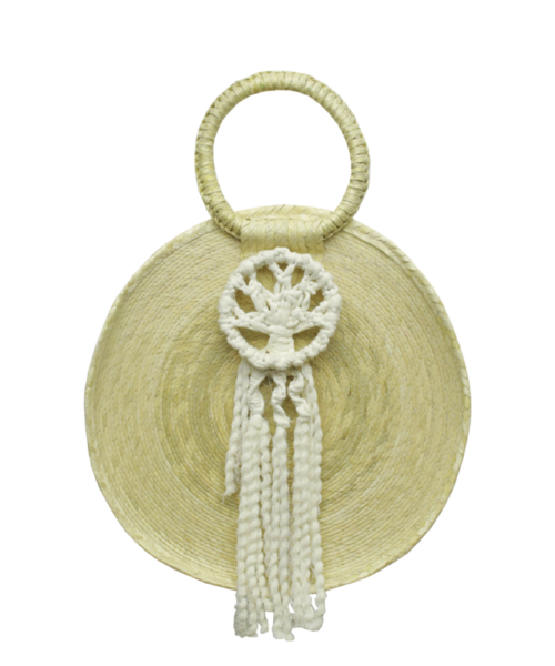 Descripción: Bolsa mediana en forma circular con adorno en macrame enfrente, con doble asa de mano y un solo compartimento general.